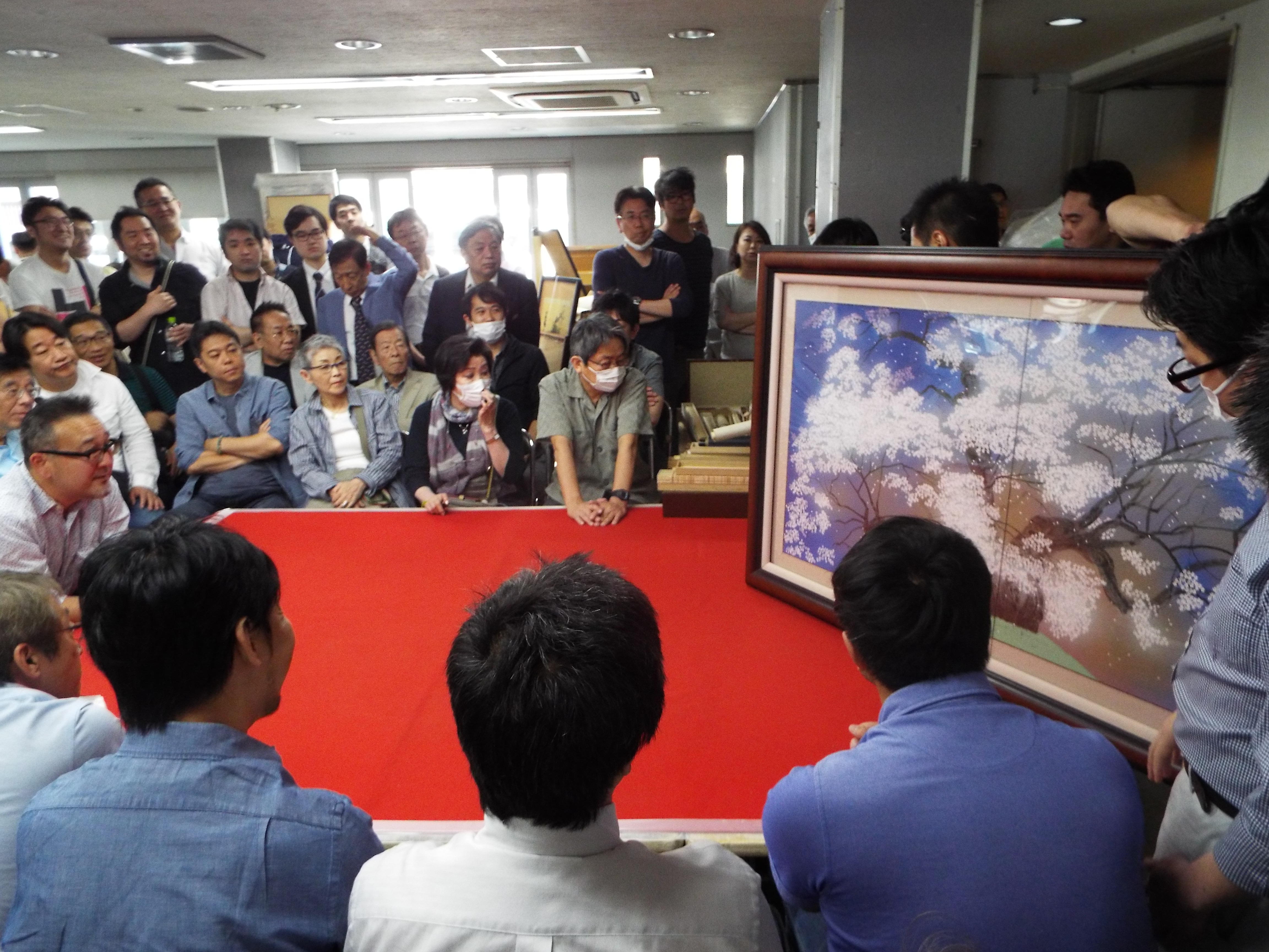 在日本的各个大中小城市里,有一种名曰“美术交换会”的机构,即如中国的小小拍,这种“美术交换会”的出品,既没有图录也没有预展,一切都是当场亮相,当场开销。初次进入这样的会场,是能够体会到“凶险叵测,惊心动魄”的气氛。如果走眼,那么少则数十万日元,多则上千万日元,就会在一瞬间付之东流了。晋鸥是众多的“美术交换会”的常客会员,他认为,这无疑是一种风险,但风险里却常常会碰到可心的机会。只要沉着果断,谨慎行事,还是能够在灯火阑珊处捡到小漏,中漏和大漏的。