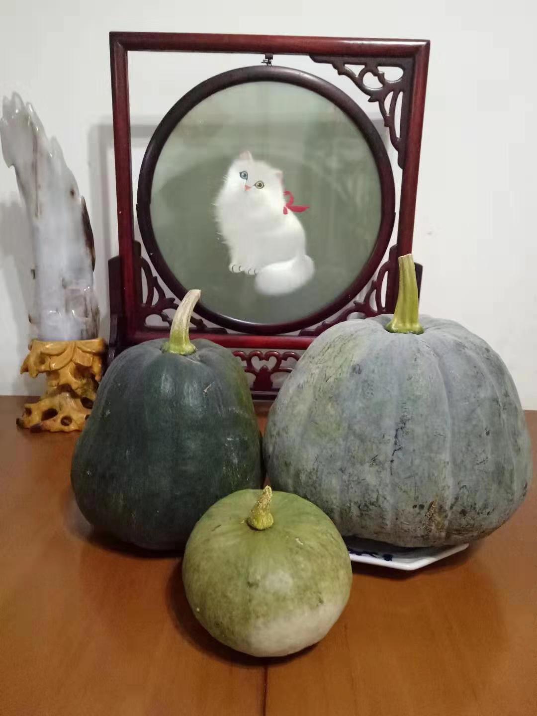 到了八月份,几个南瓜一直长到约有十斤重,迫不及待地摘采下来,放在家里当着工艺品欣赏。后来天目山的老乡说,等它完全黄了再摘采下来,可以再长很大!