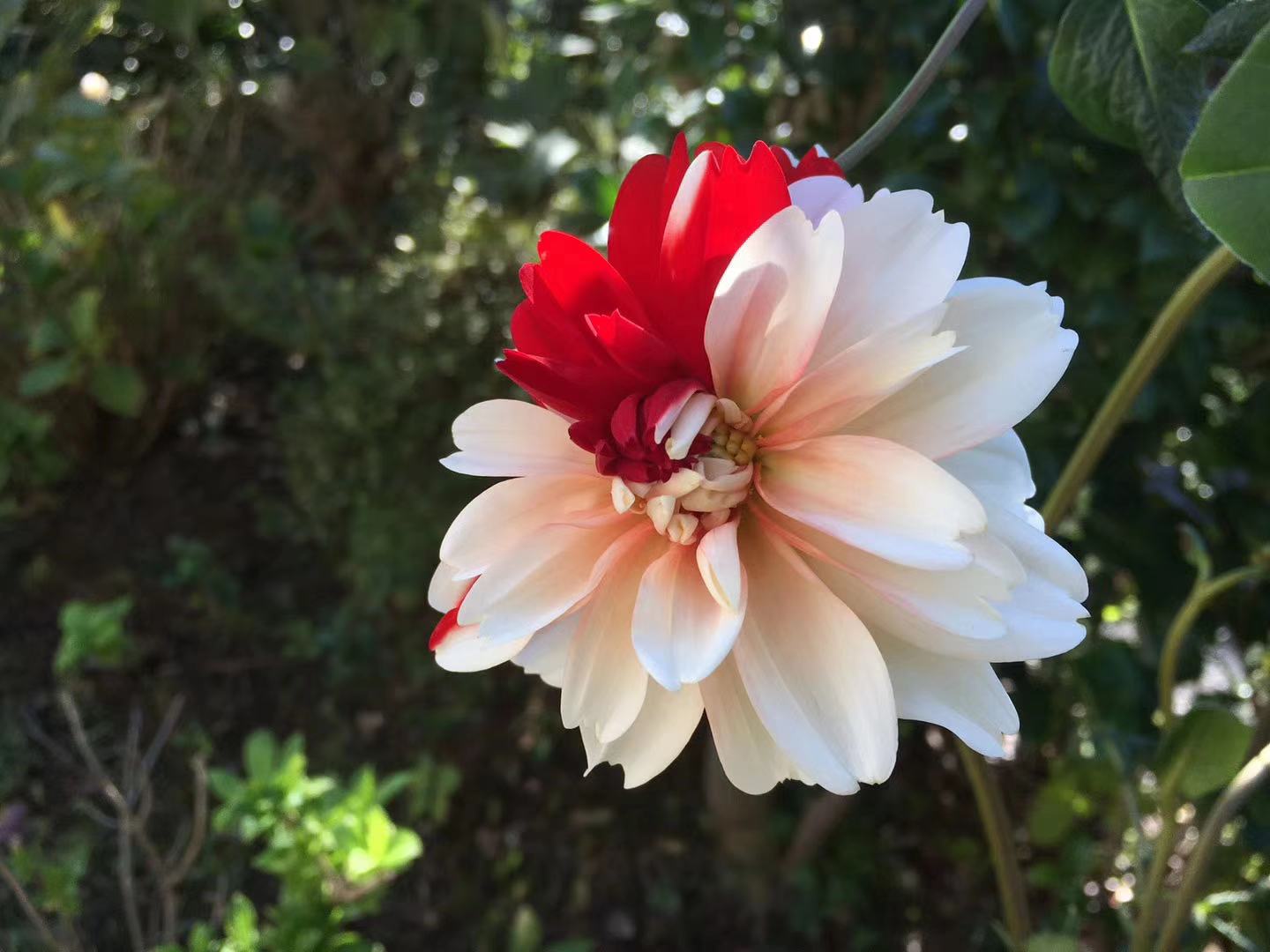 无独有偶,去年早春有朋友送来一块大理花的根茎。不经意的埋在了土里,没想到它很快的发芽抽茎,成长起来了,到了十月它开花了。两种不同颜色的花瓣相聚在同一朵花卉上,红的是那样的艳丽,白的又是那样的纯洁。大自然的造物主啊,我不知道该如何的感谢你。
