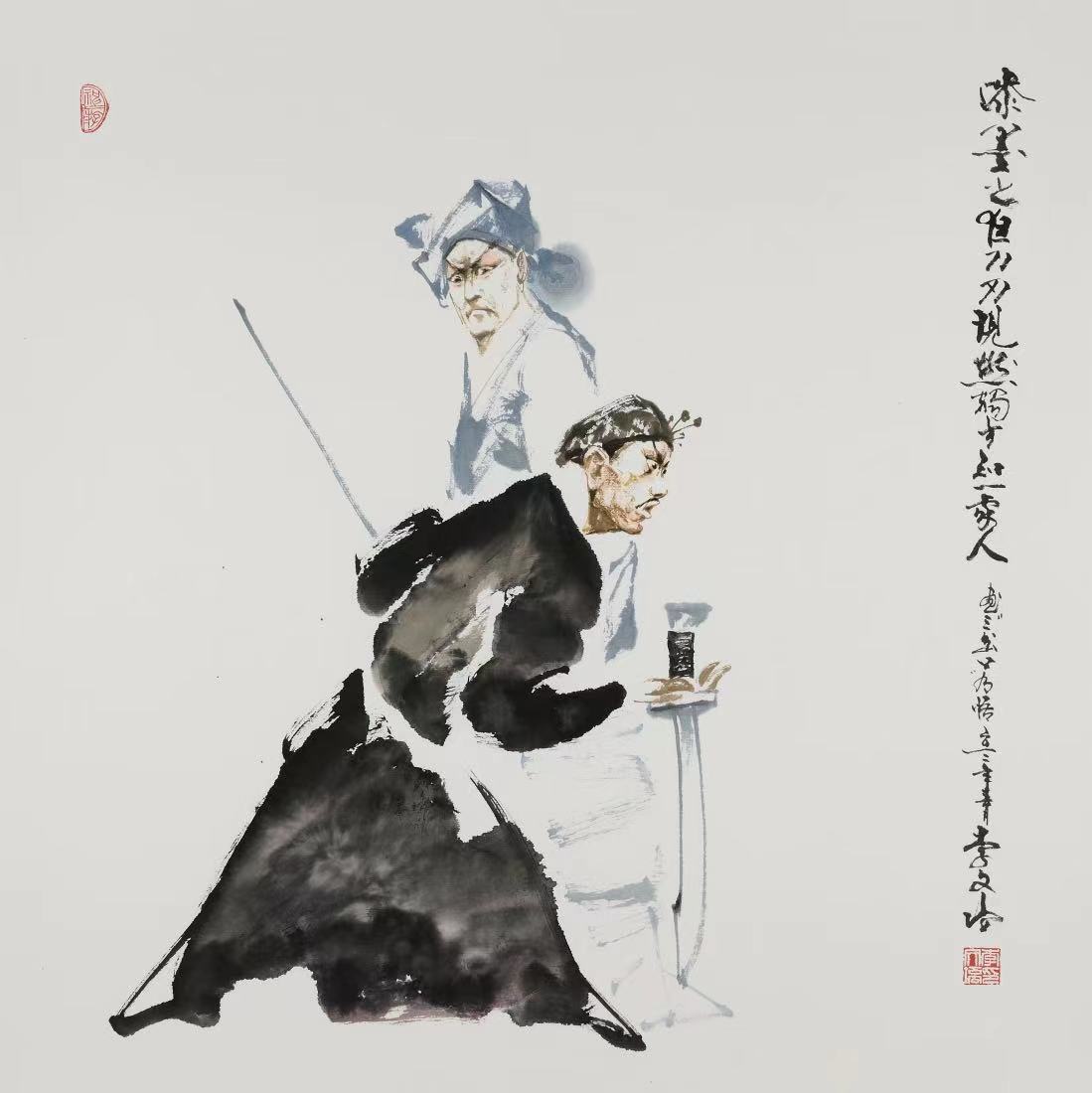 然而,李文培先生創作上的幾近絕情的選擇打破了我們在動態人物,尤其是舞台動態人物上的欣賞慣性!斷然阻斷了我們在動態人物畫審美上的輕車熟路。這就是畫家對「吳帶當風」的毅然離反!筆者如此擇辭並非意味著李文培先生在潑墨寫意簡筆人物畫方面有首創之功,畫家自己也不諱言古代人物畫大師梁楷作品對他的影響;而是他的那份選擇。那麼我們不禁首先要問的是:畫家對簡筆人物選擇的邏輯起點是什麼呢?筆者以為首先是畫家對京劇藝術特點的把握。那麼什麼是京劇藝術的特點呢?我們知道,世上三大表演體系中,相對於斯坦斯拉夫斯基的「進入角色」和布萊希特的「高於角色」,都有不離真實的傾向;而梅蘭芳體系三大特點居首位的是寫意性(虛擬性),或者是否可以說是一種不同於舞台具體真實性的象徵性。如臉譜的規範定性讓觀眾一望即知,省略了具體的人物個性。